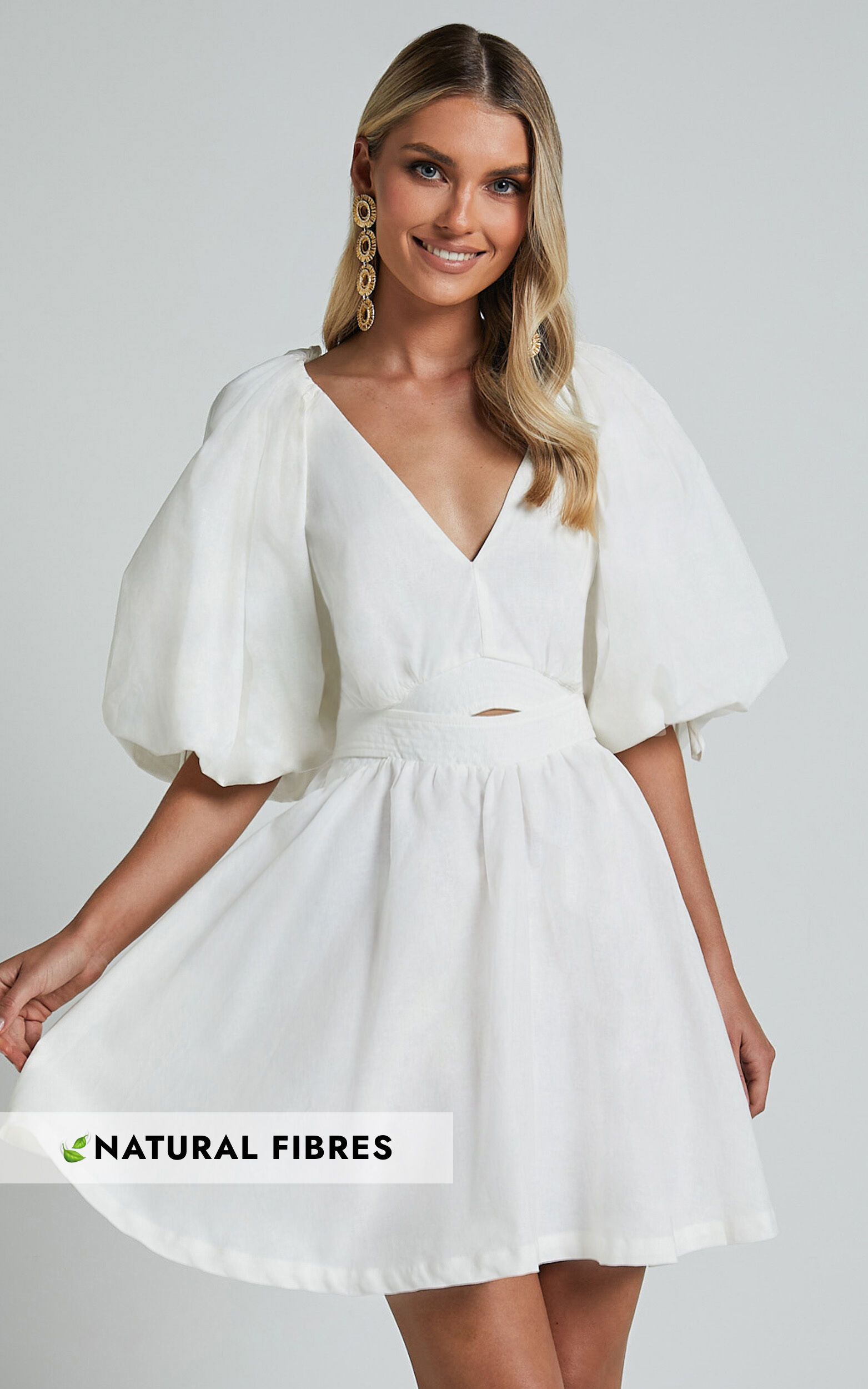 Amalie The Label - Movida Linen Blend Balloon Sleeve Crossover Band Mini Dress in White